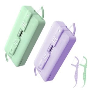 Adorila 2 Pack Dental Floss Picks Portable Dispenser, Refillable Dental Floss Sticks Case, Travel Floss Storage Case for Teeth Cleaning (Purple, Green)