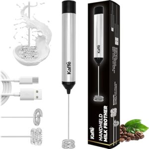 Kaffe Premium Milk Frother. Milk Frother Handheld for Coffee. Handheld Milk Frother Electric w/Powerful Rechargeable Motor (No Batteries Reqd. Includes USB Cable, Single/Double Whisks)