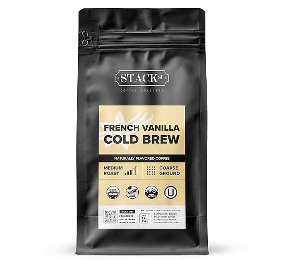 Organic French Vanilla Flavored Cold Brew Coffee Coarse Ground 1 LB – Smooth Dark Roast, Coarse Grind – By Stack Street