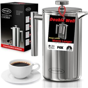 SterlingPro French Press Coffee Maker(1.75L)-Double Walled Large Coffee Press with 2 Free Filters-Enjoy Granule-Free Coffee Guaranteed, Stylish Rust Free Kitchen Accessory-Stainless Steel French Press